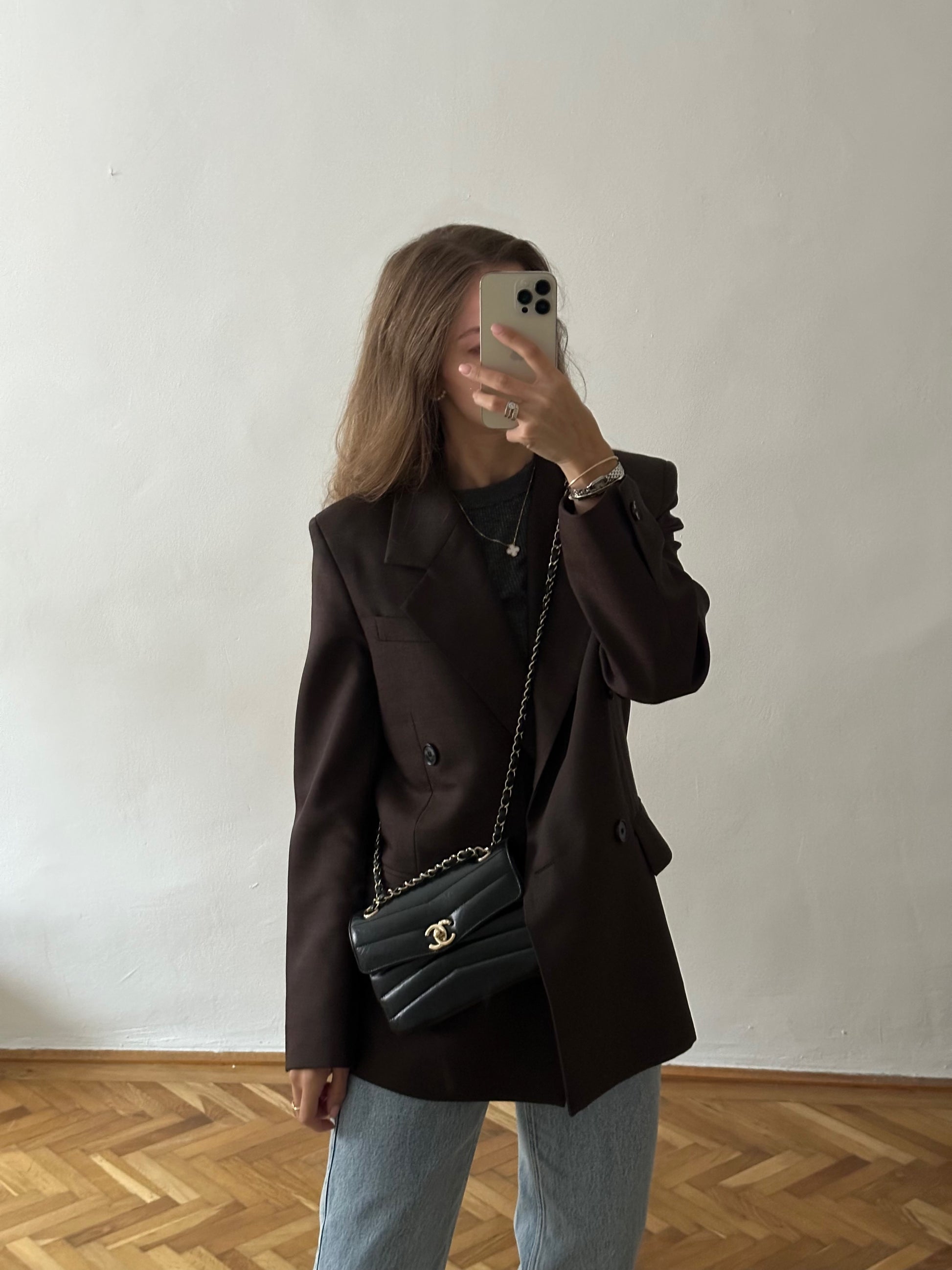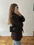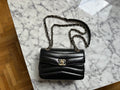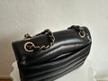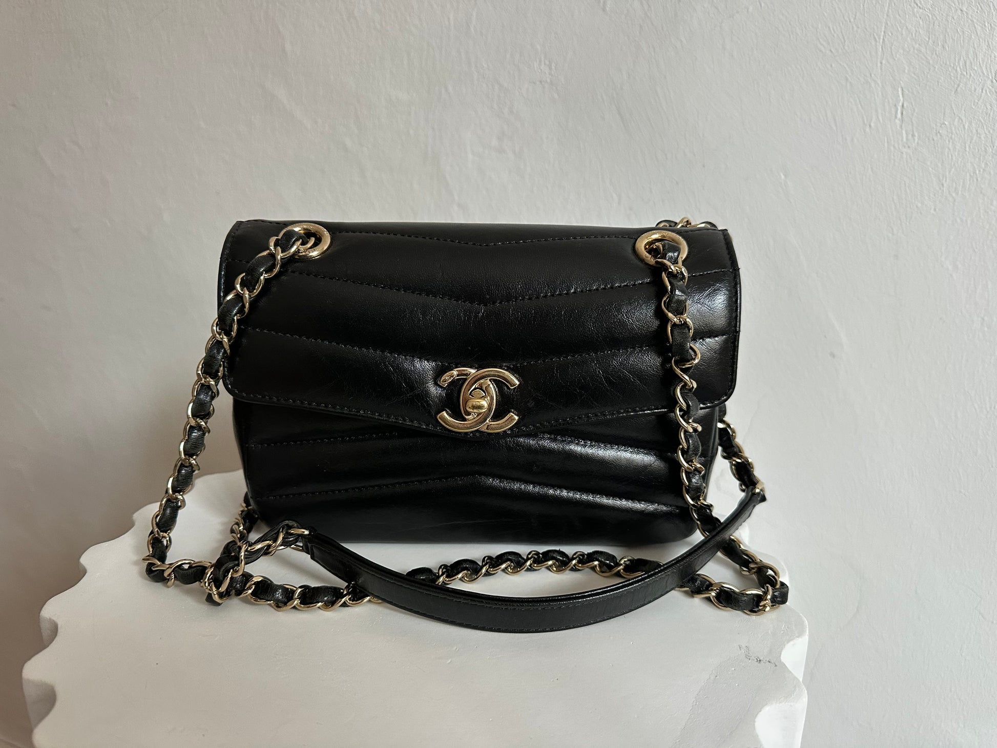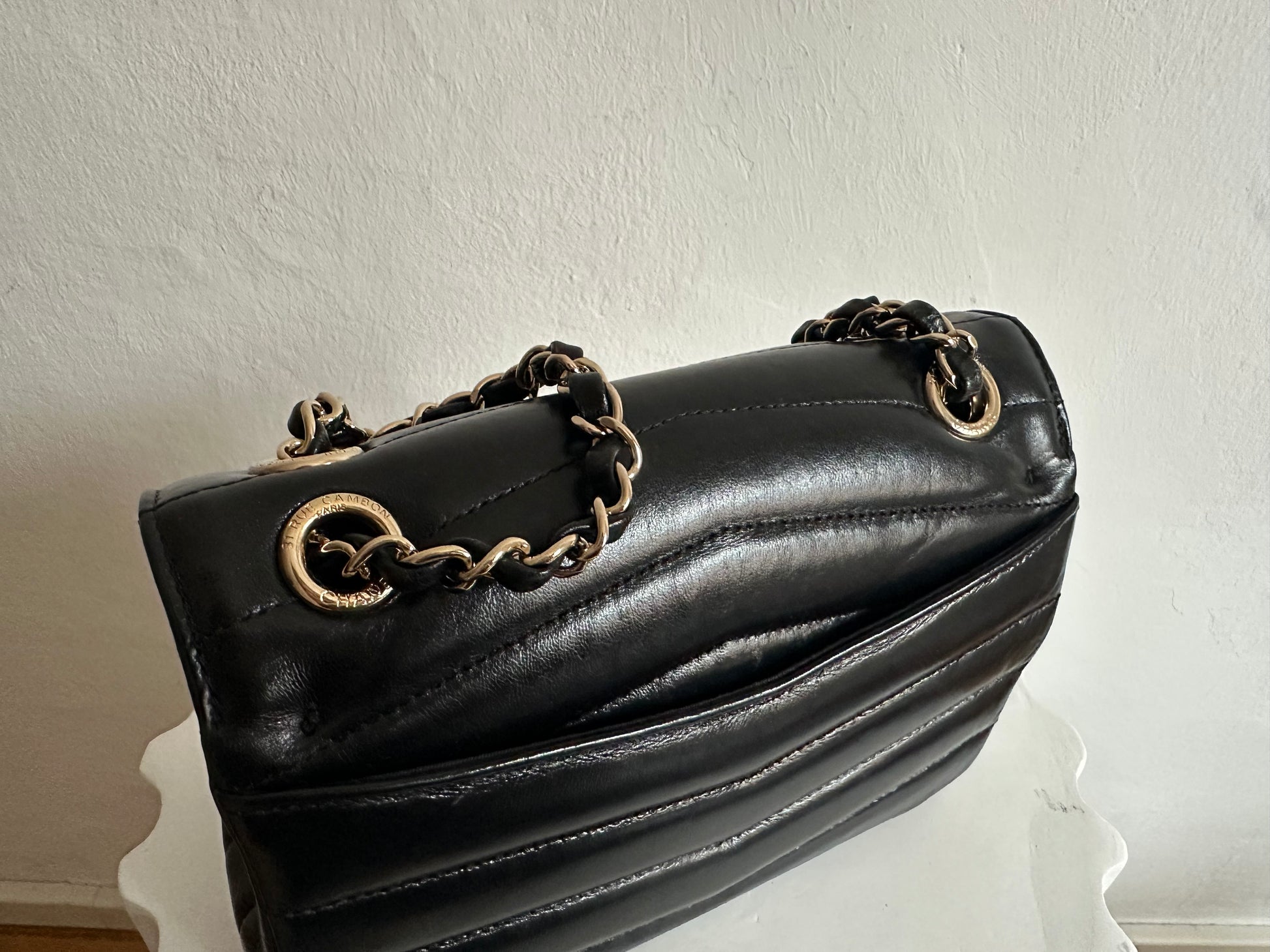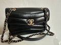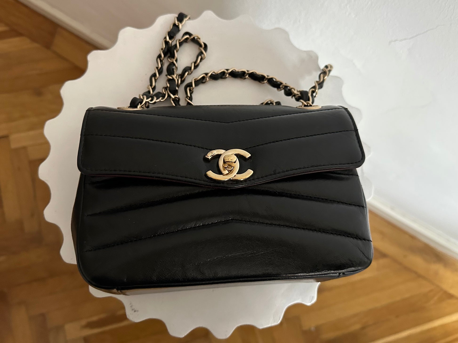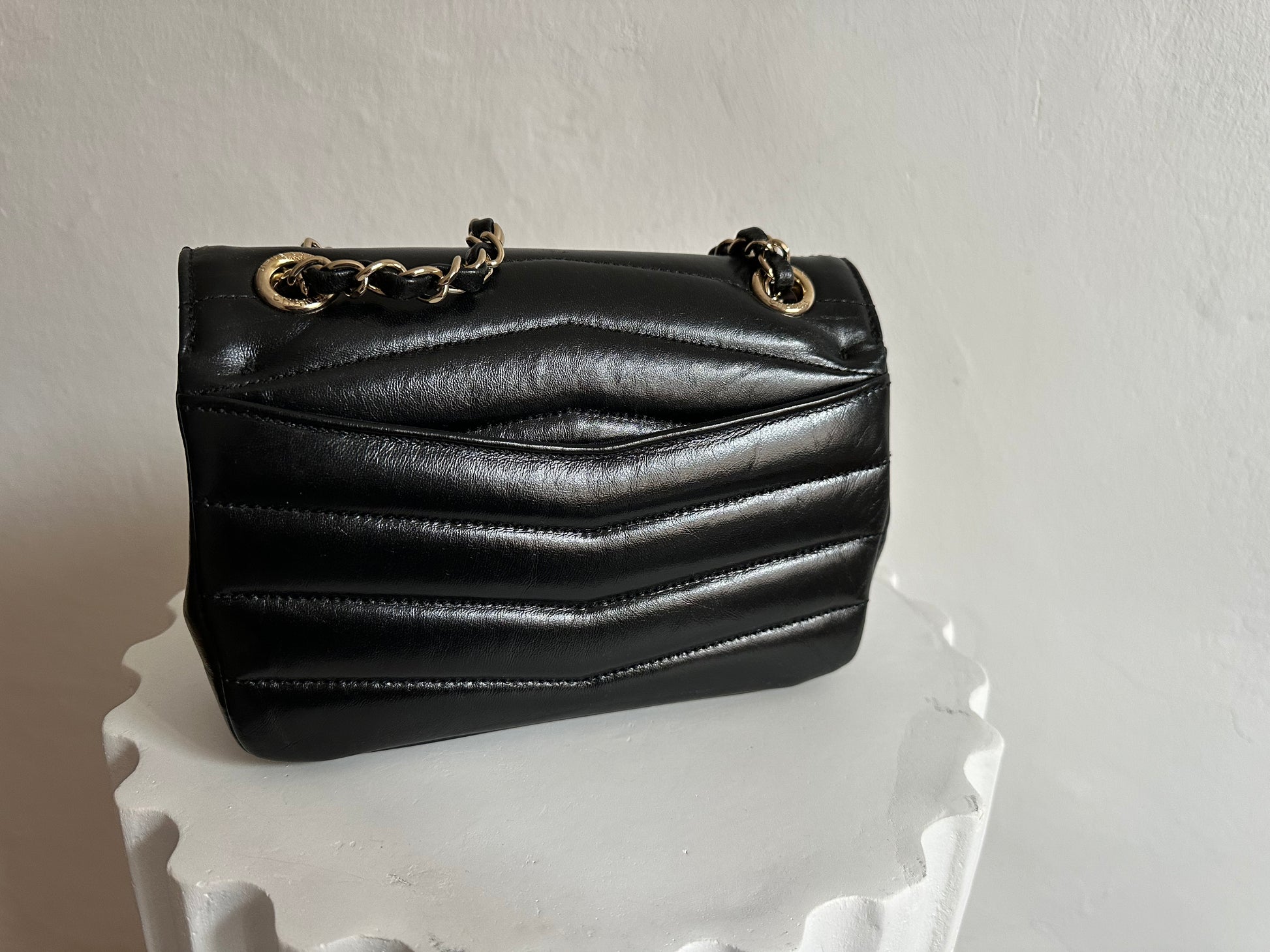 Chanel Small Chevron Miroir Flap Bag in black lambskin leather.