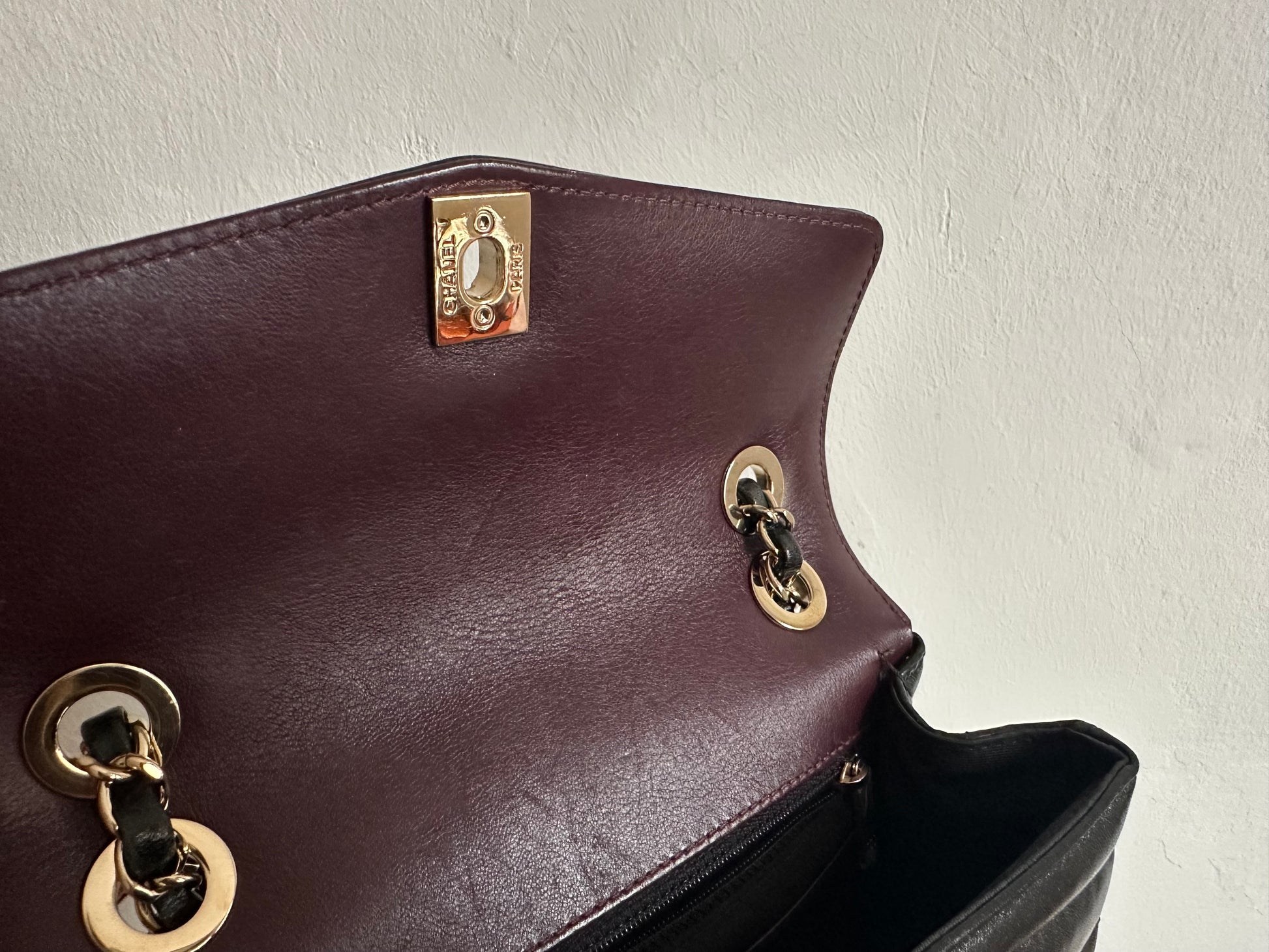 Condition: very good condition: some stains on the leather of the bag (see photos), the leather on the chain is worn but not particularly noticeable.